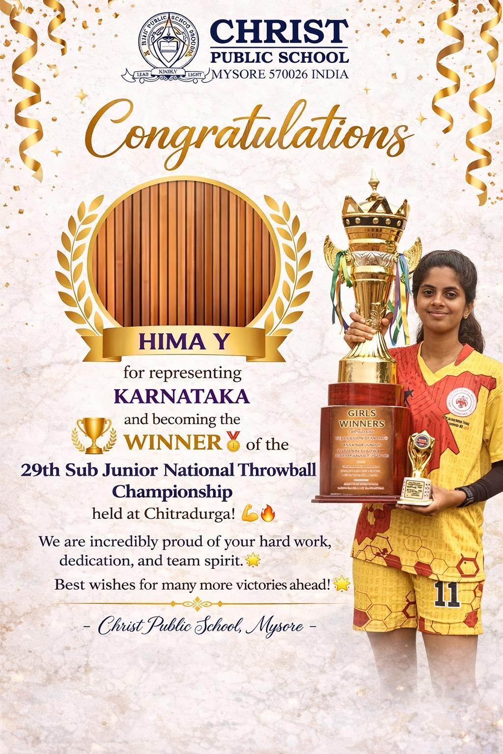 Christ Public School Mysore proudly congratulates Hima Y on her outstanding achievement in sports excellence. She has brought immense honor to the school by representing Karnataka and securing the Winner position at the 29th Sub Junior National Throwball Championship, held at Chitradurga.